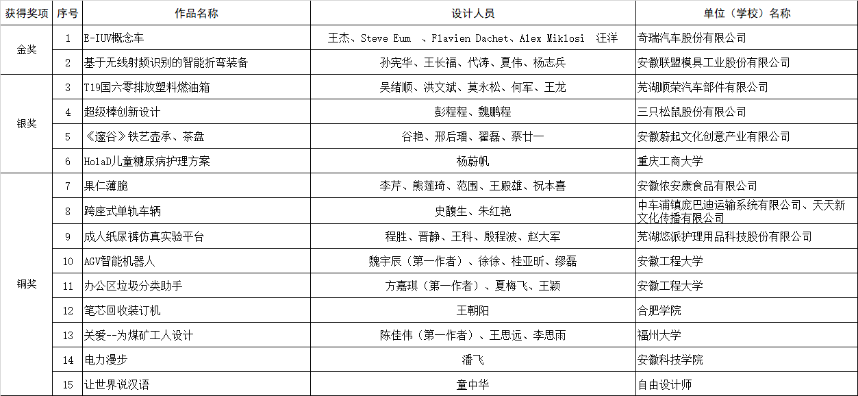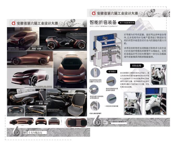 最終,來自奇瑞汽車的E-IUV概念車(概念設計)與安徽聯盟模具工業有限公司的基于無線射頻識別的智能折彎裝備( 實物產品)榮獲本次大賽金獎,從設計理念、產品外形、先進技術在產品中的應用以及解決行業痛點等關鍵問題上,以上作品在行業中均處于領先水平。同時,來自順榮股份、三只松鼠、美的冰箱、中車龐巴迪(蕪湖)、安徽工程大學、安徽工業大學等企業、高校投稿作品也在本次大賽中取得了優異的成績。